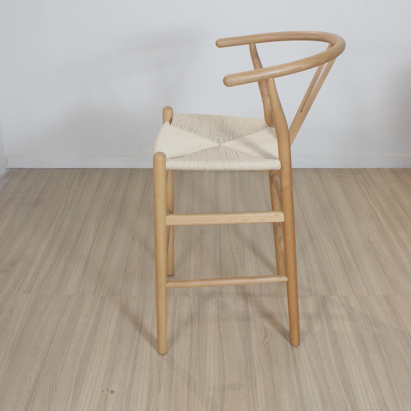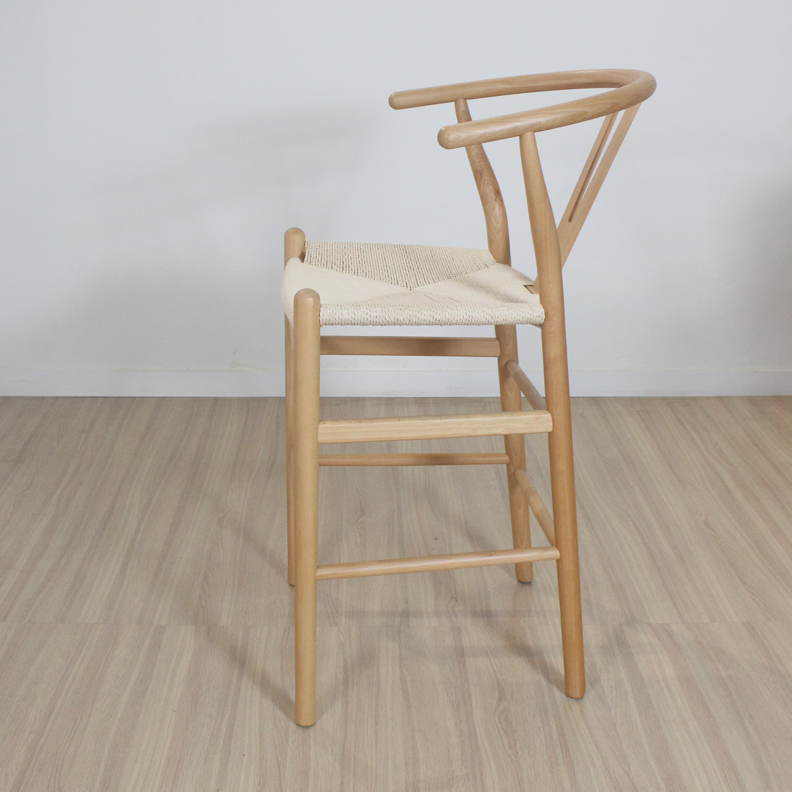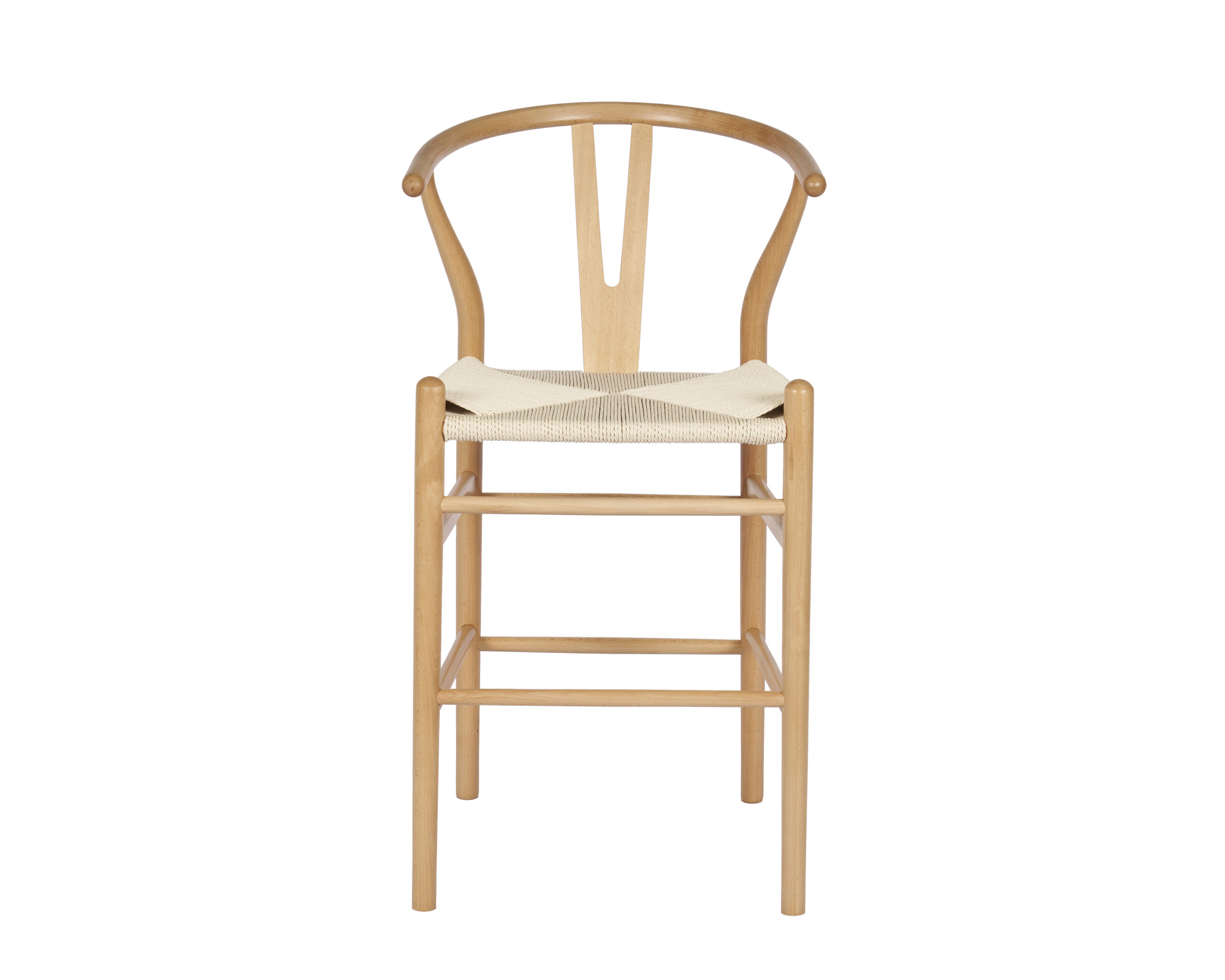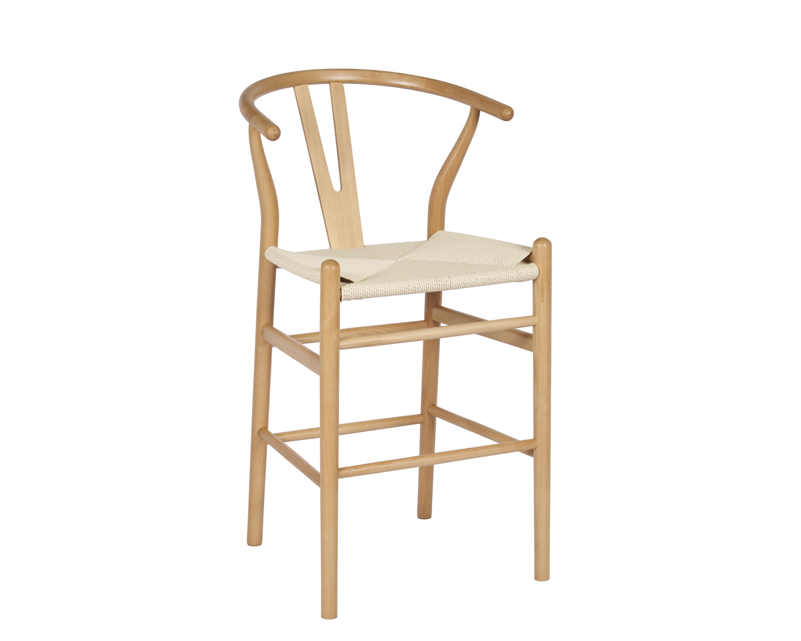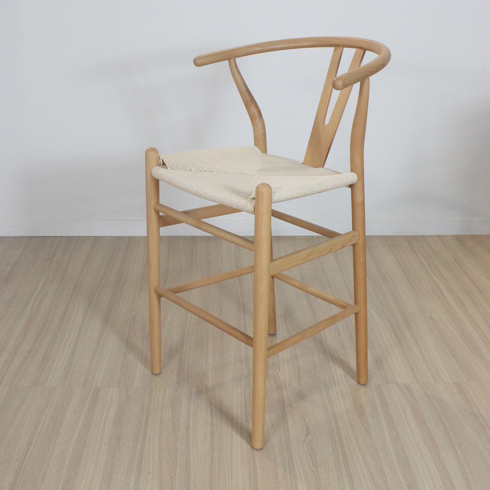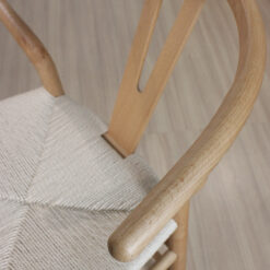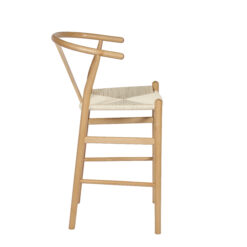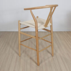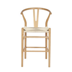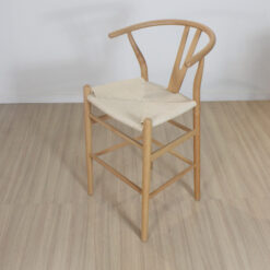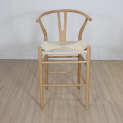 Banqueta Wishbone de madera haya con asiento tejido de hilo natural.