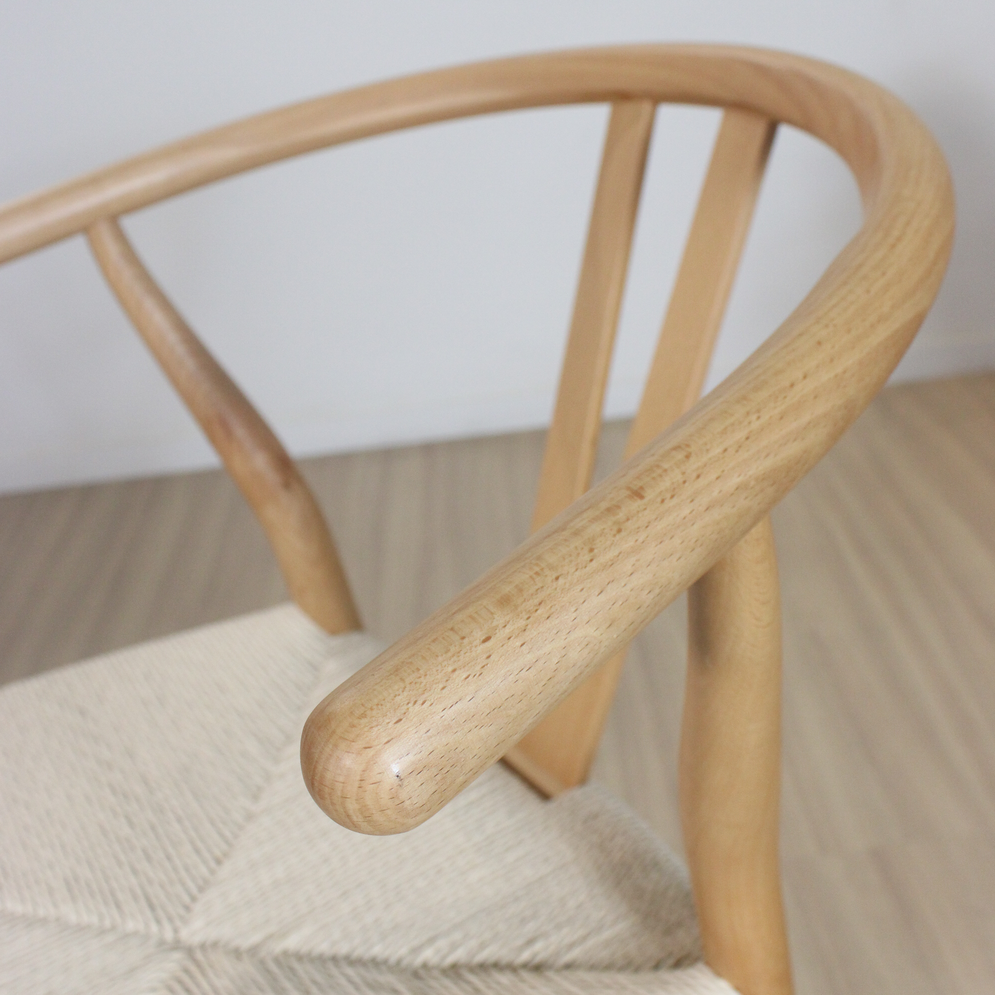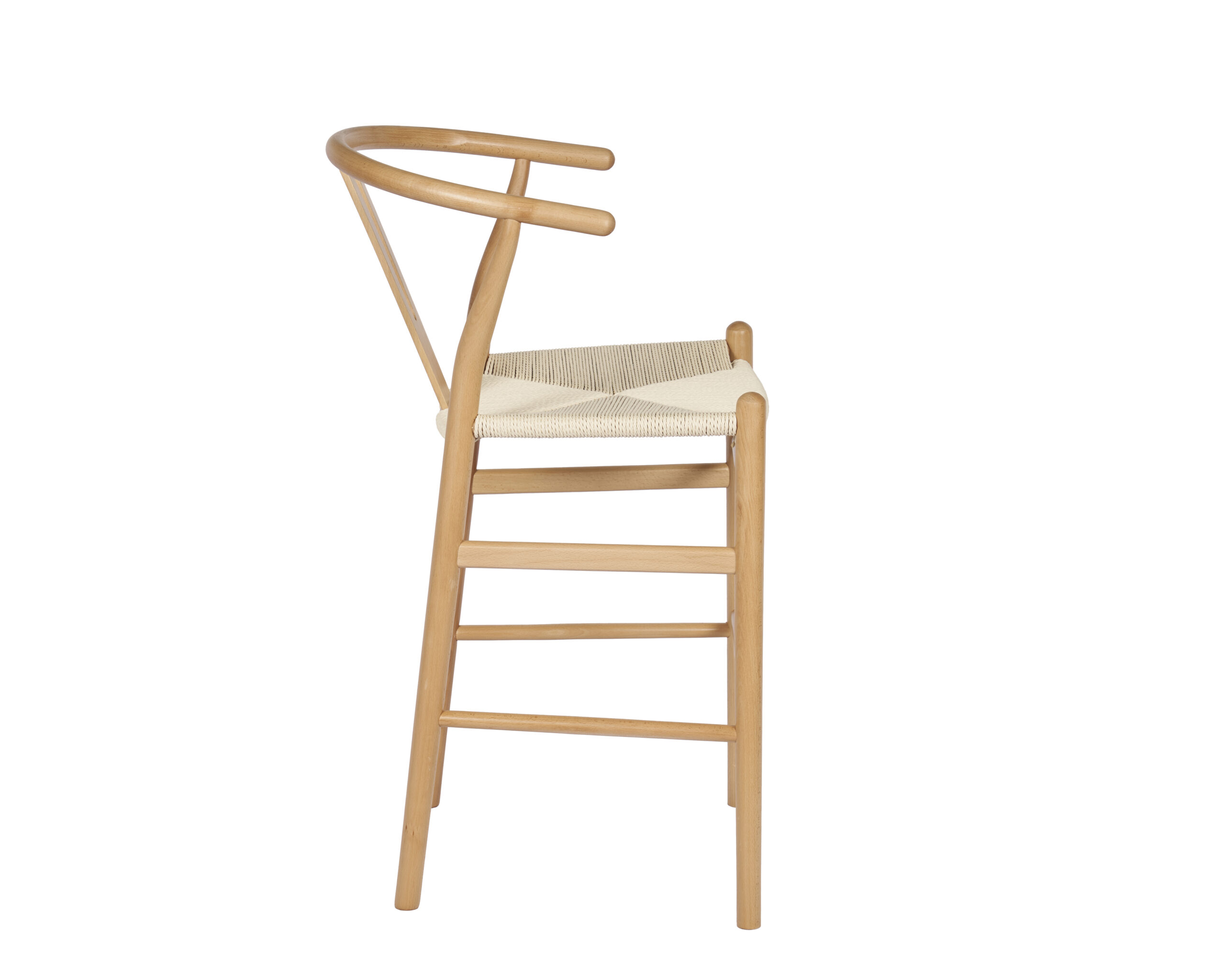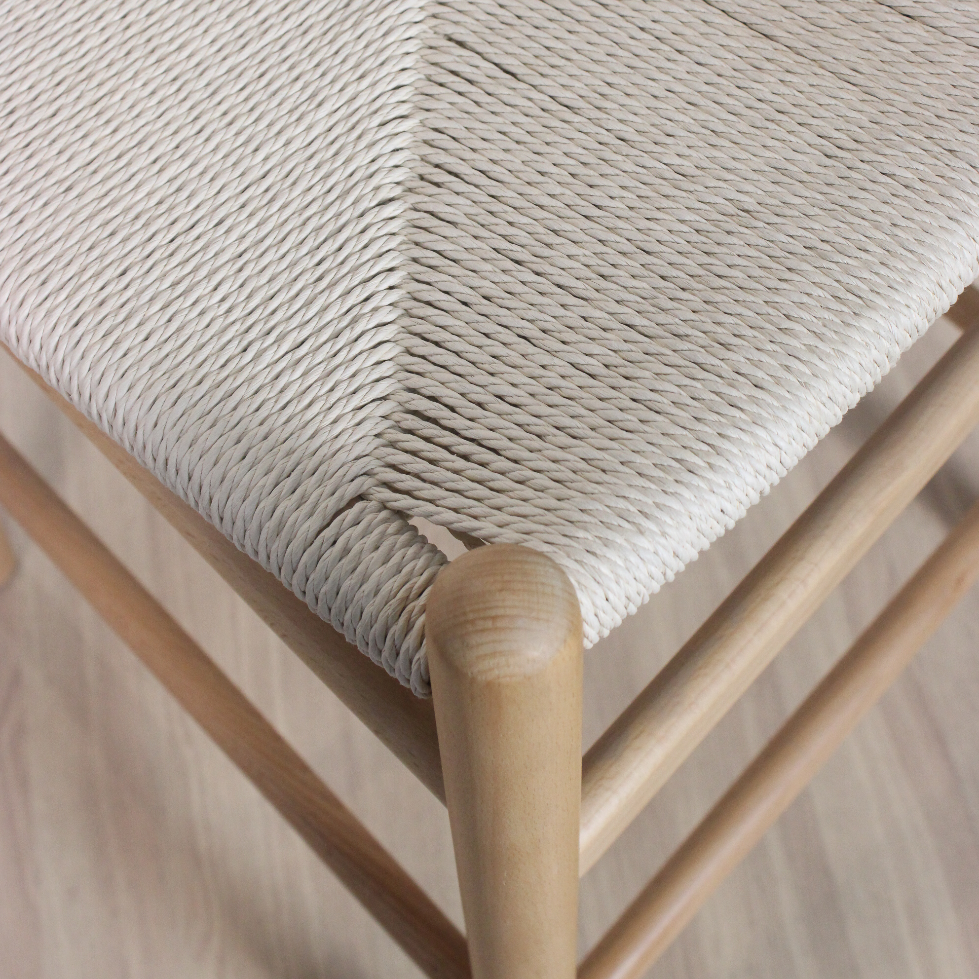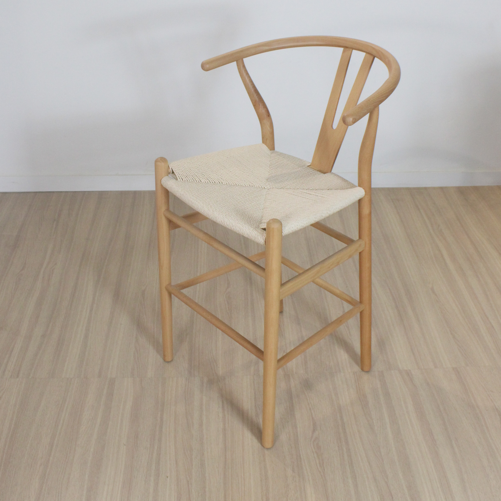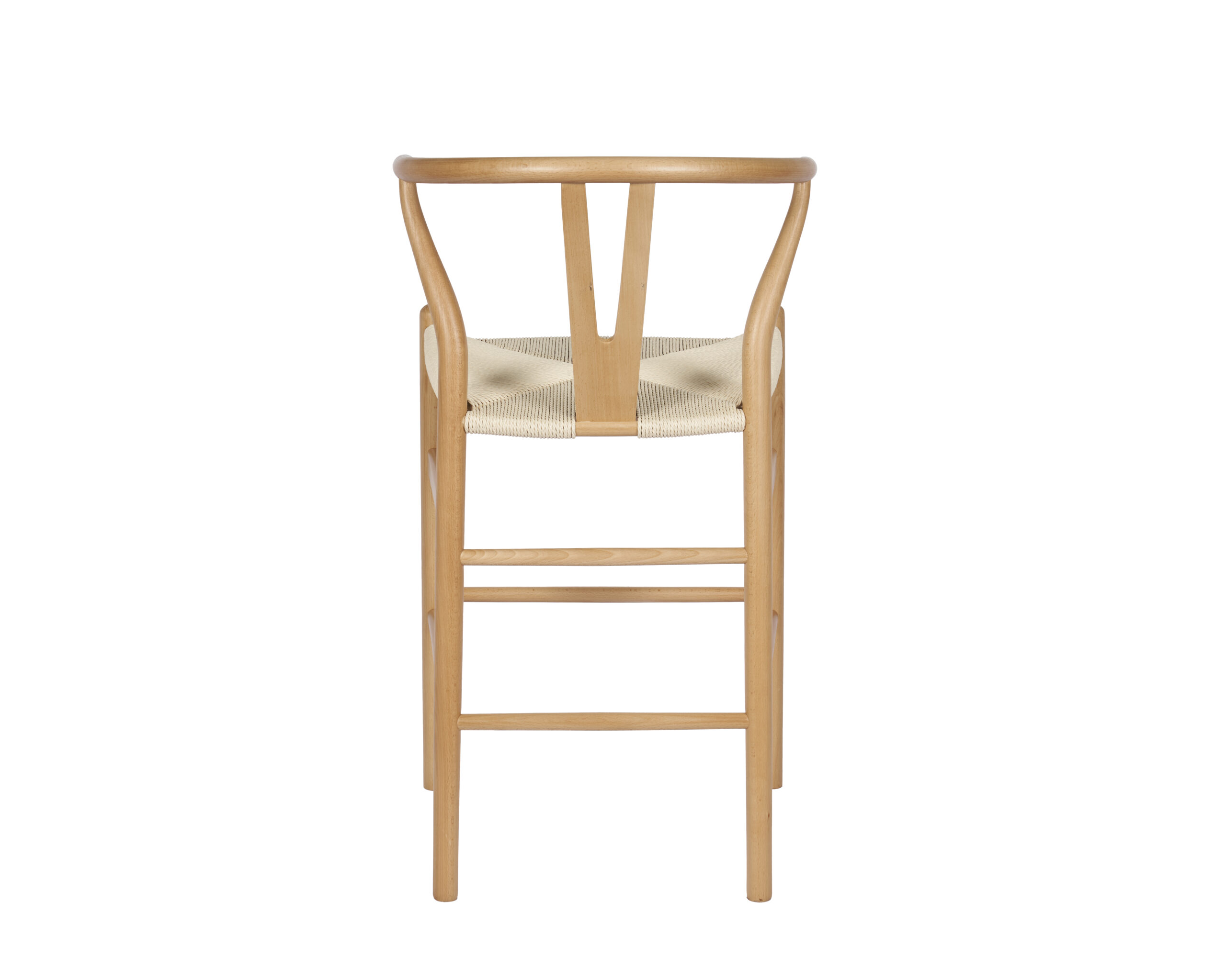 Banqueta Wishbone de madera haya con asiento tejido de hilo natural.