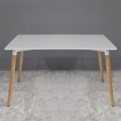 Mesa rectangular de diseño nórdico hecha en tapa de madera (MDF) laqueada. con patas de madera lustrada y topes reguladores antideslizantes.