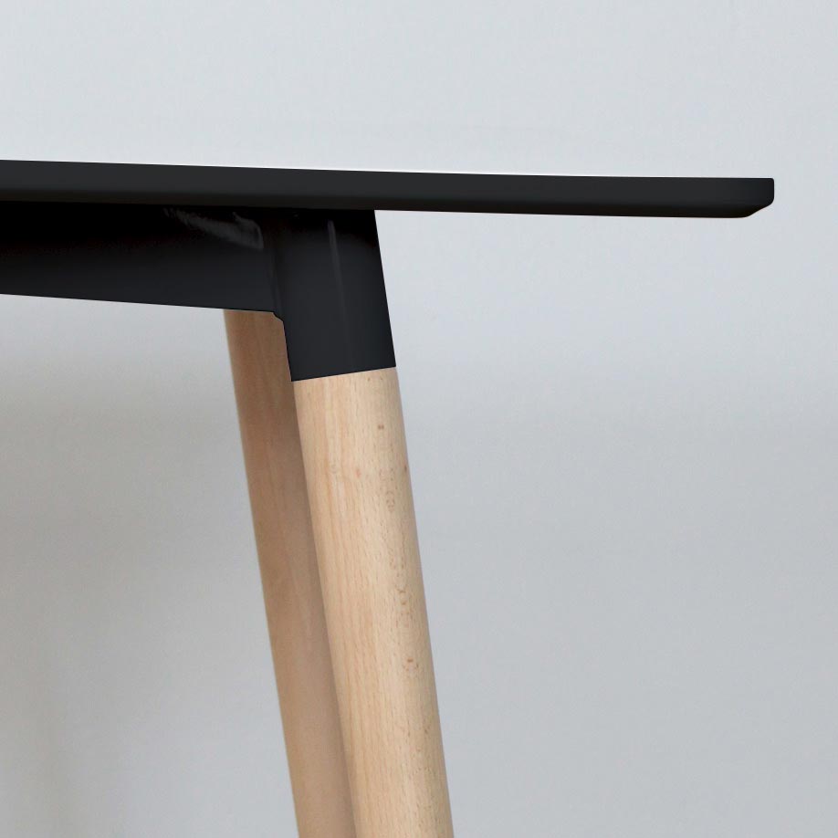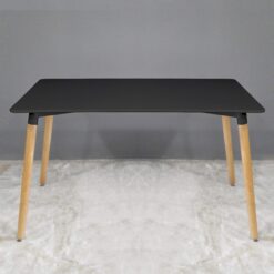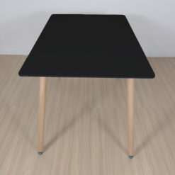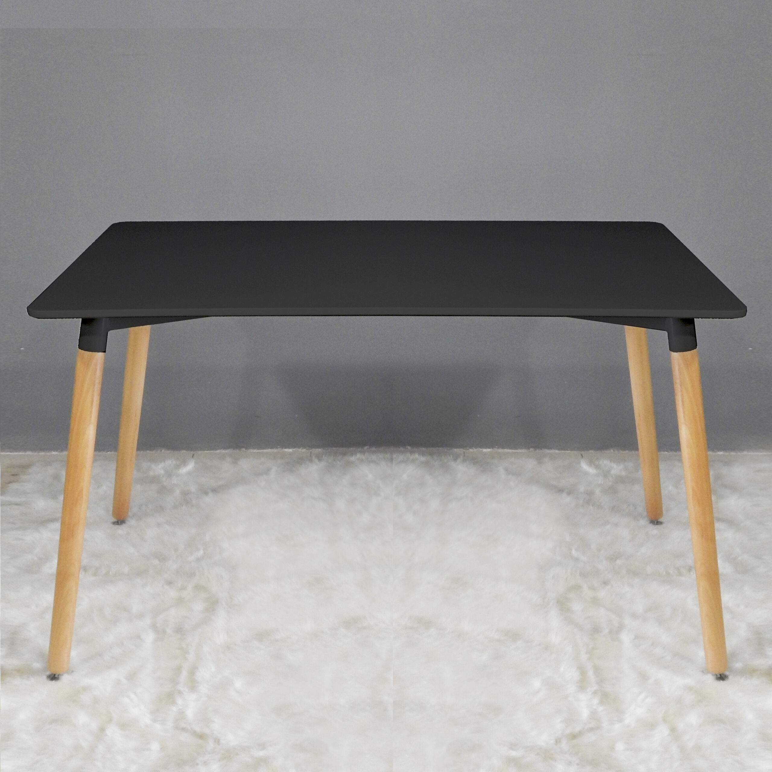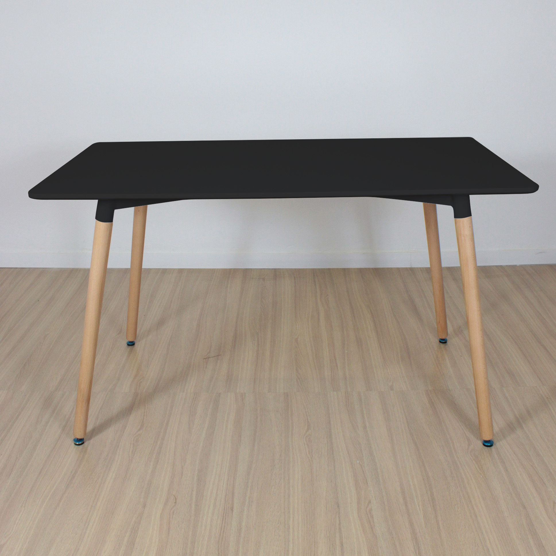 Mesa rectangular de diseño nórdico hecha en tapa de madera (MDF) laqueada. con patas de madera lustrada y topes reguladores antideslizantes.