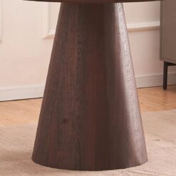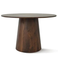 Mesa Geordia redonda de diseño hecha en madera (MDF) con acabado de wood veneer paper (la chapa de madera es un corte de madera “delgado como el papel” que se aadhiere, mediante pegado o prensado al MDF.