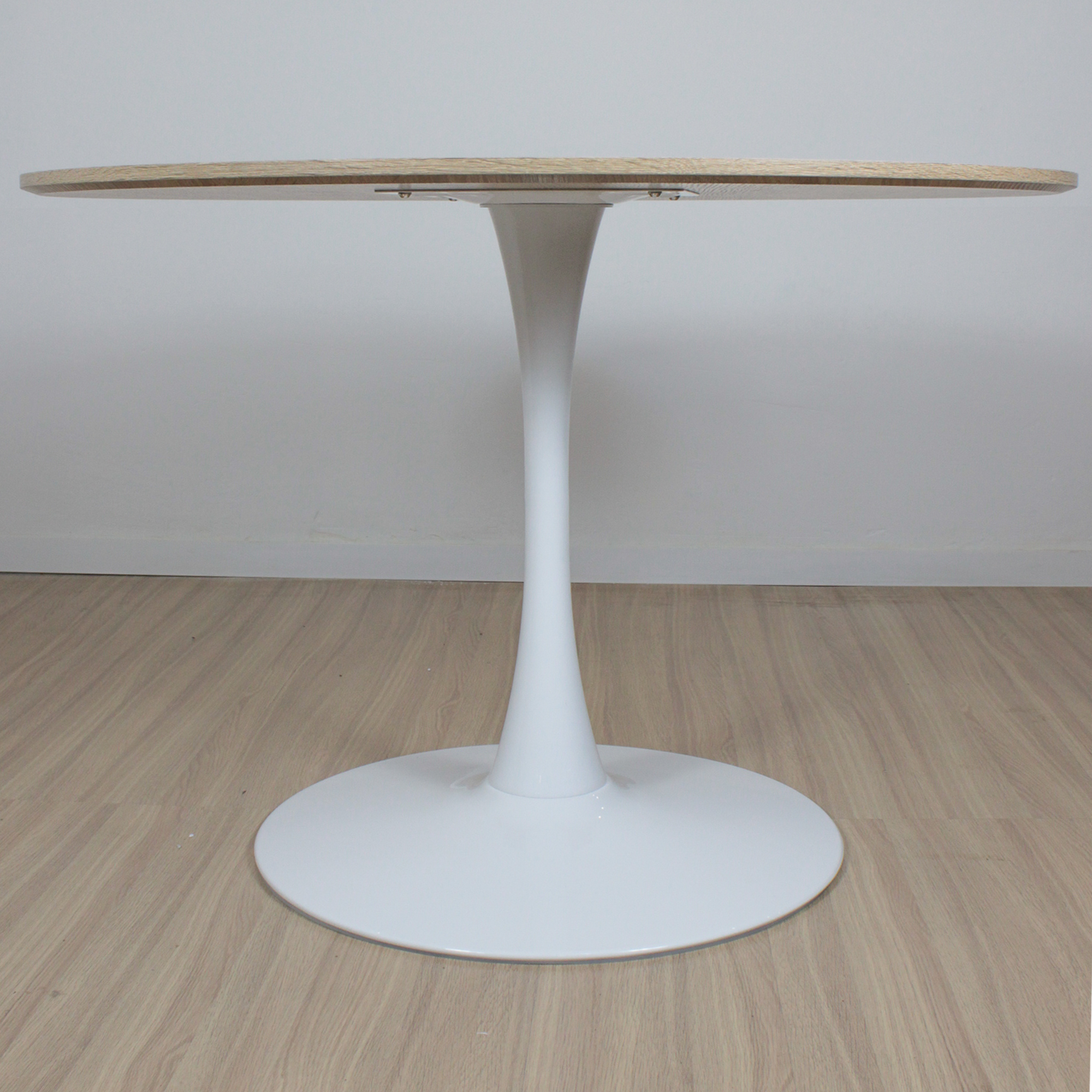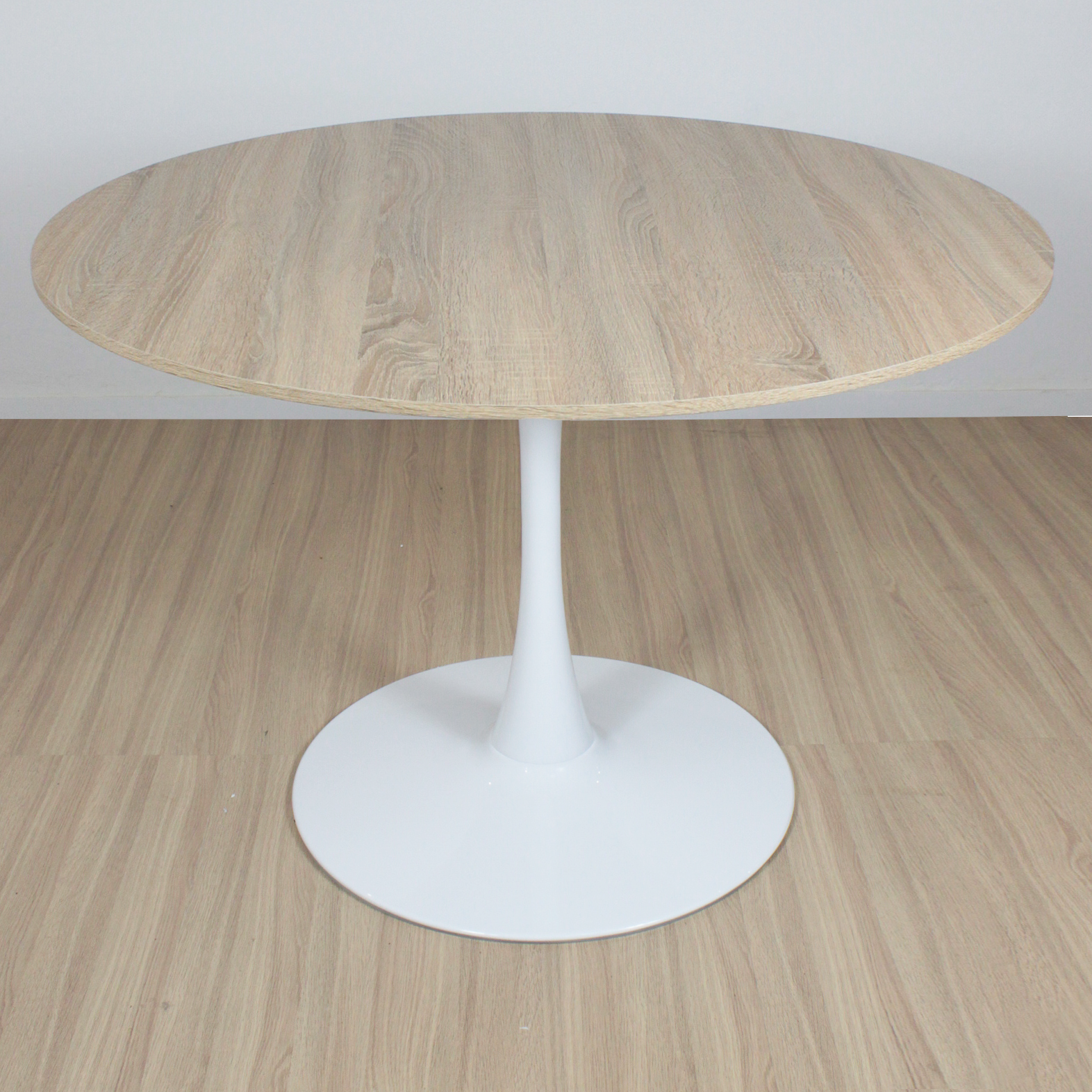Mesa Toscana redonda de diseño hecha en madera (MDF) con acabado de wood veneer paper (la chapa de madera es un corte de madera “delgado como el papel” que se adhiere, mediante pegado o prensado al MDF. Pie metálico.