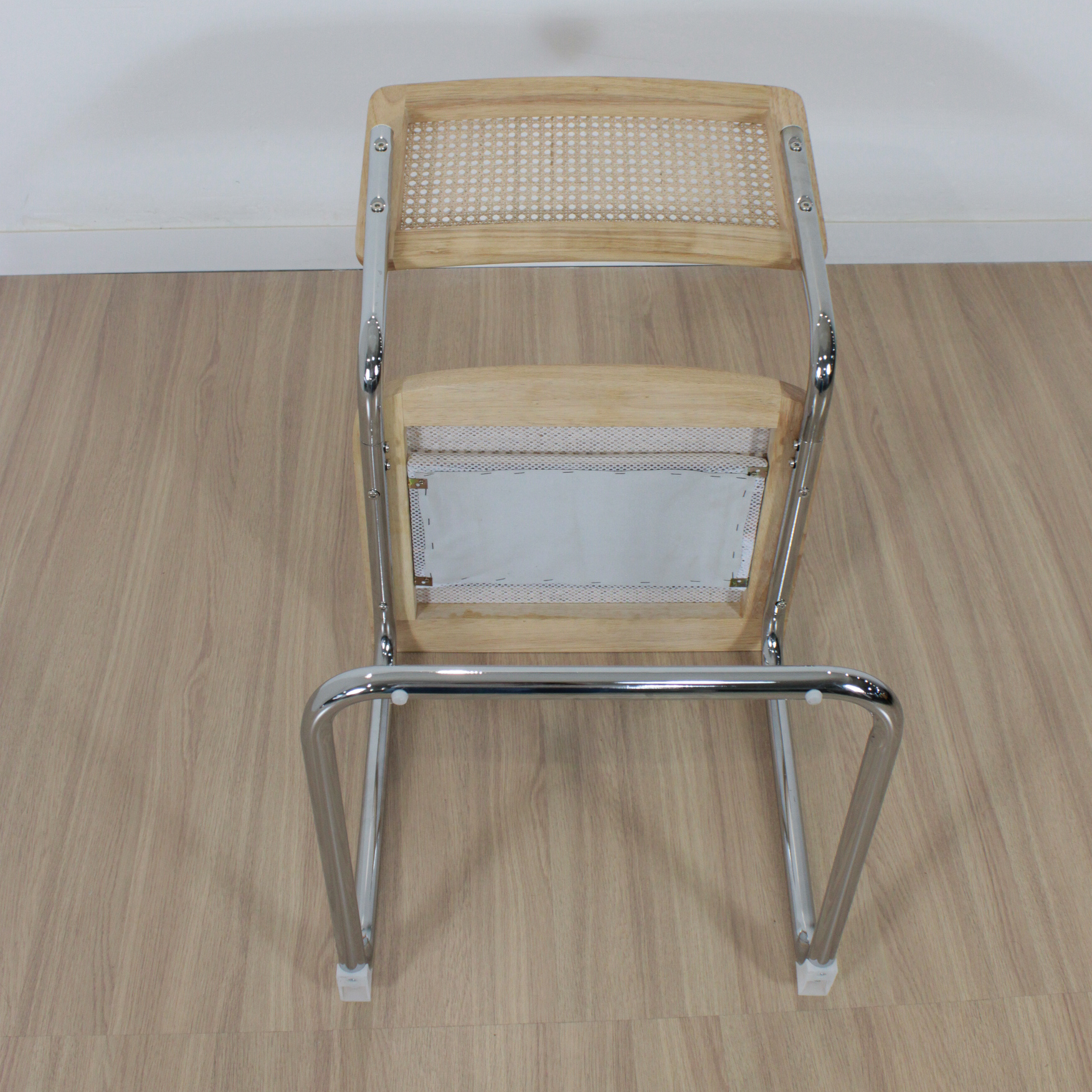 Silla de estructura metálica cromada. Asiento de madera con asiento de rattan natural.