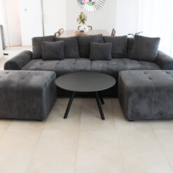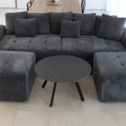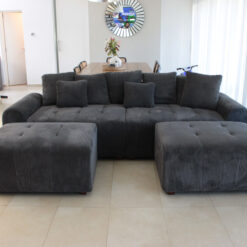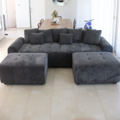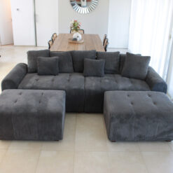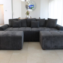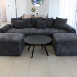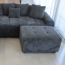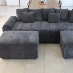 Sofa Ibiza tapizado en tela de corduroy de 350 grs. Con patas de madera maciza, densidad goma espuma de 24 kg.